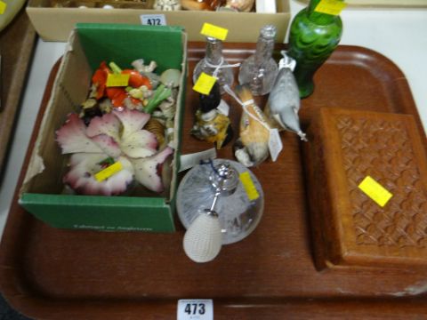 A parcel of items including Wade Whimsies, small silver topped bottles, Royal Worcester model birds, boxed coinage & badges etc