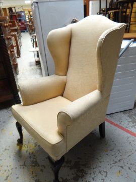 Early nineteenth century wingback armchair on raised cabriole legs in a cream & gold fabric