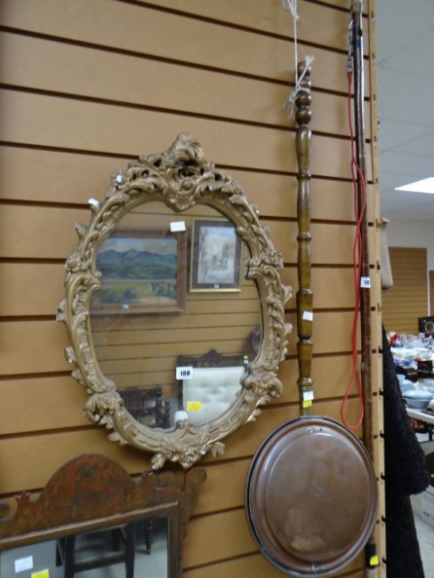 Small ornate gilt plaster framed mirror together with a copper bed warming pan