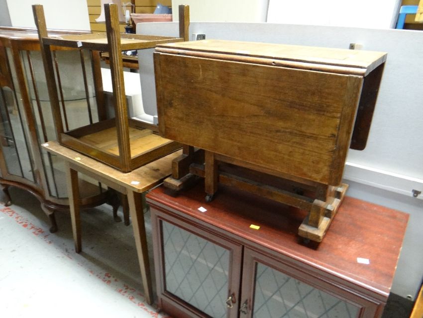 A neat vintage oak drop leaf side table together with a TV cabinet and two other tables