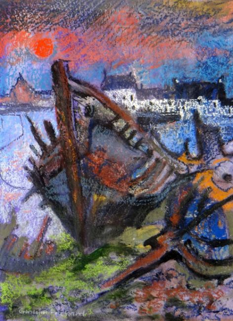 GWILYM PRICHARD mixed media on paper - beached boat timbers, cottages and sunset, entitled verso 'Carcass 5', signed, 38 x 28cms