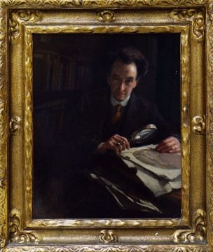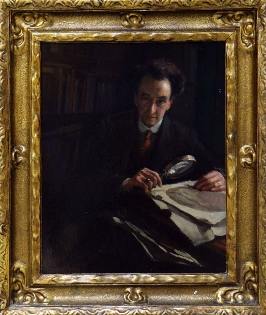 CAREY MORRIS oil on board - portrait of a middle-aged gentleman holding a magnifying glass at a desk, entitled 'The Connoisseur' (label not present), and dated to 1920, signed, 49 x 39cms Auctioneer's note: the sitter has the appearance of, the Plaid Cymru founder Saunders Lewis Provenance: Please see Page. 56 of 'A Celtic Canvas - Life and Times of Carey Morris Artist 1886-1968' by Glyn Rhys (Y Lolfa Cyf, 2013)