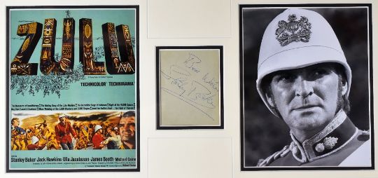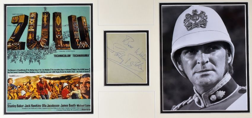 STANLEY BAKER autograph - signed 'Best Wishes...' and framed together with a 'Zulu' cinema poster reprint and a black and white promotional photograph of the actor as Lieutenant John Chard in the same film, 41 x 71cms (inc. frame)