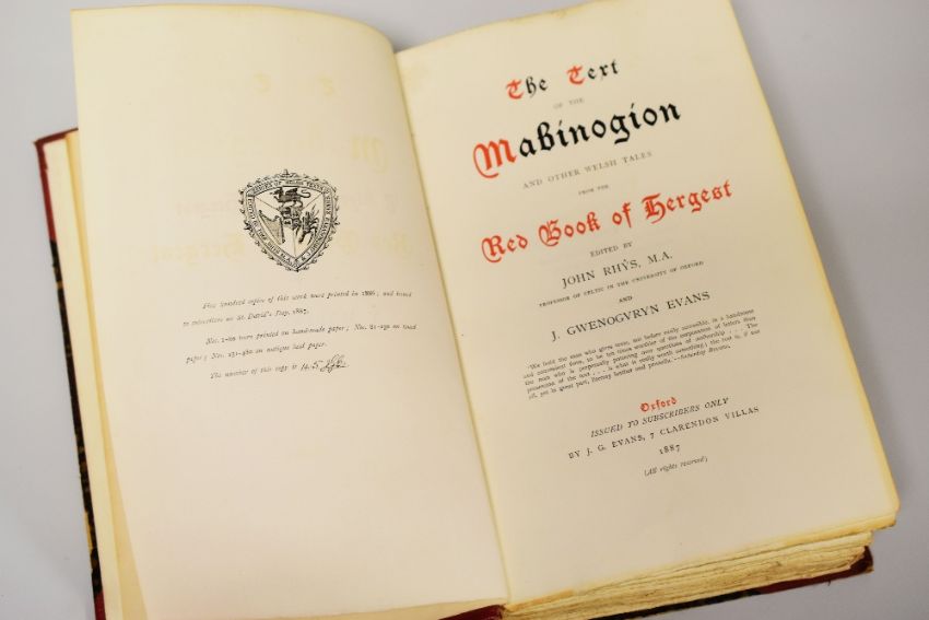 VOLUME NO.45 OF 'THE RED BOOK OF HERGEST, VOL 1' and 'Other Welsh Tales', published by J G Evans, 1887, fly-page with plate for Baron Dynevor