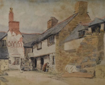 ENGLISH SCHOOL watercolour - historic buildings Machynlleth with figure washing, inscribed verso 'The Old Parliament House Buildings, Wales' and stated that the back of the paper is dated 1913 and that the artist is unknown, 32 x 40cms