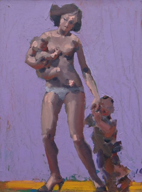 KEVIN SINNOTT oil on board - nude cradling baby and with small child, signed with initials, 41 x 31cms