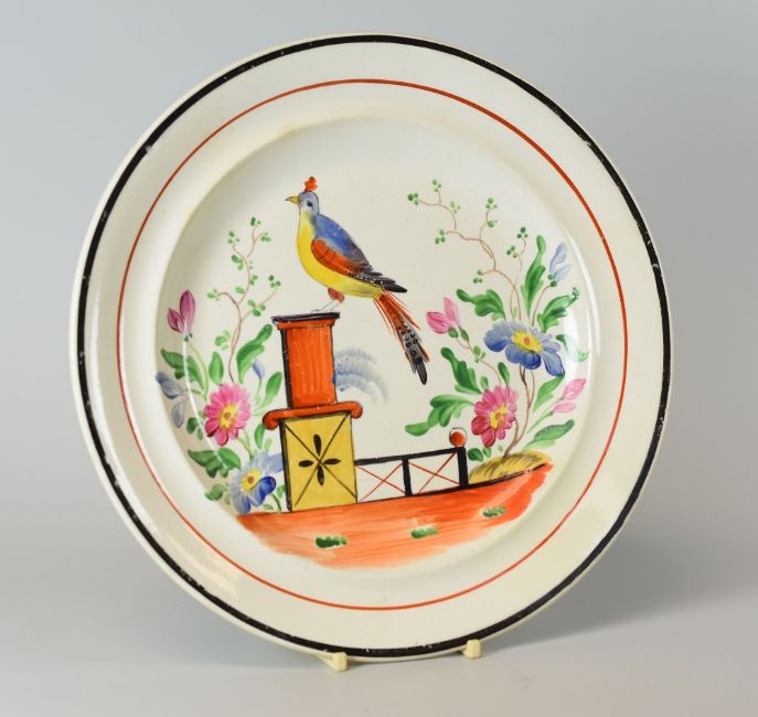 A DILLWYN & CO SWANSEA POTTERY PLATE 'Bird on Pedestal' pattern with colourful decoration, impressed mark, 24cms diam