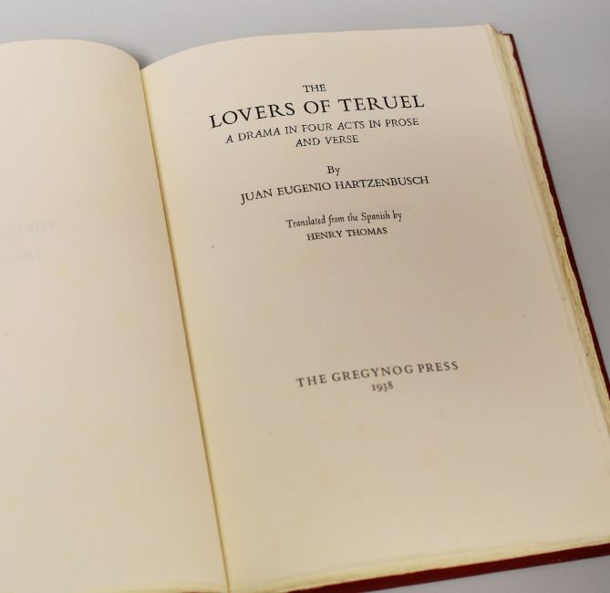 LOPE DE VEGA limited edition (1/175) Gregynog Press volume of 'The Star of Seville', dated 1935, printed with red and black inks having a coloured vignette to title and colophone, full dark blue calf binding with gilt designs to covers together with J B Hartzenbusch limited edition (1/175) Gregynog Press volume of 'The Lovers of Teruel', dated 1938, bound in full blind-stamped Morocco leather