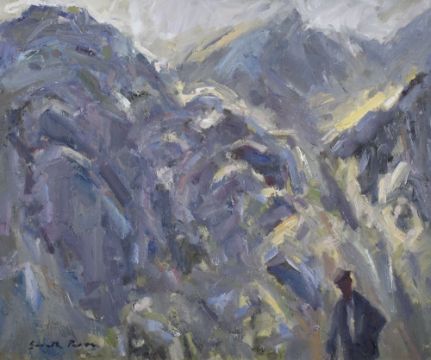 GARETH PARRY oil on canvas - figure of a farmer in a mountainous landscape, entitled 'Mewn Lle Unig yn y Bore - Nant Peris, Eryri' (In a Lonely Place in the Morning - Nant Peris, Snowdonia), signed, 47 x 59cms Provenance: 2007 purchase receipt - Kooywood Gallery, Cardiff