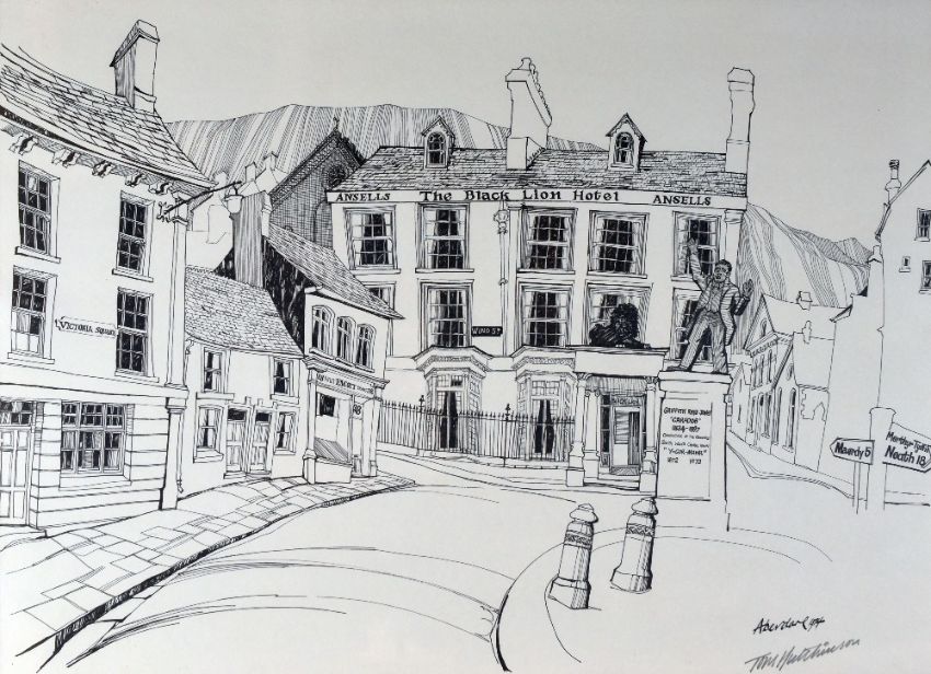 TOM HUTCHINSON print - town square entitled 'Aberdare', dated 1974, 30 x 40cms
