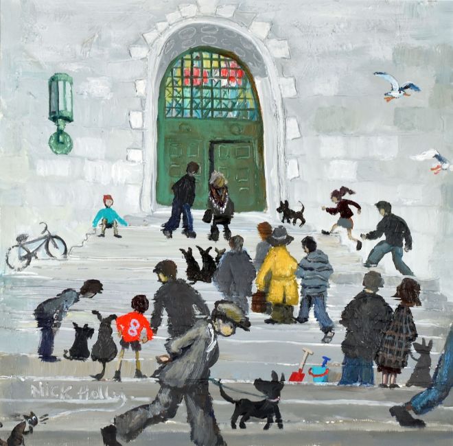 NICK HOLLY oil on board - entitled verso 'Brangwyn Hall Steps', signed, 29 x 29cms