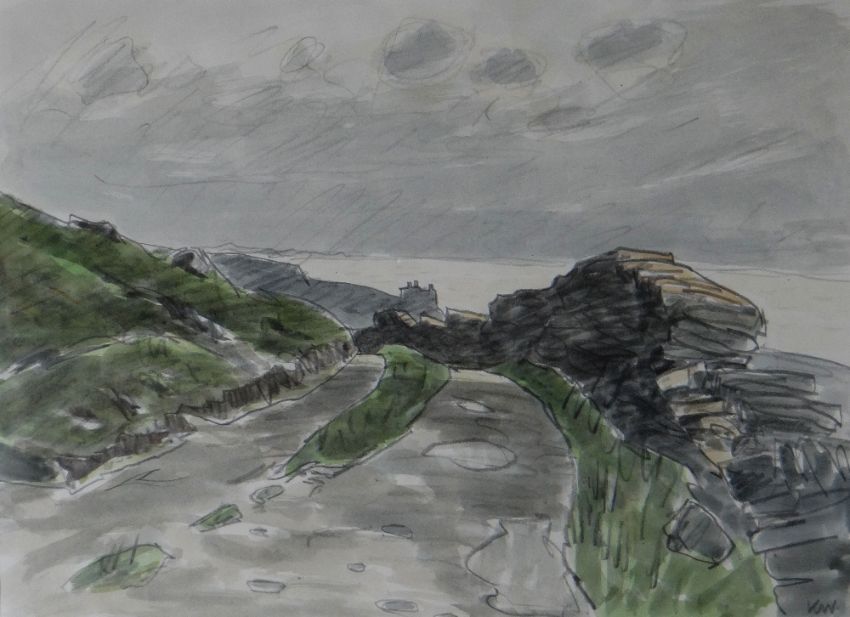 SIR KYFFIN WILLIAMS RA watercolour - roadway leading to Harlech Castle with adjacent dry stone wall and squally clouds over the Irish Sea, entitled verso on Albany Gallery label 'Harlech Castle', signed with initials, 29 x 40cms