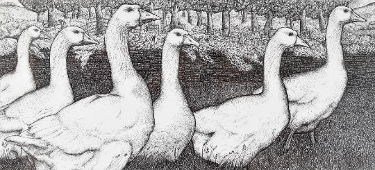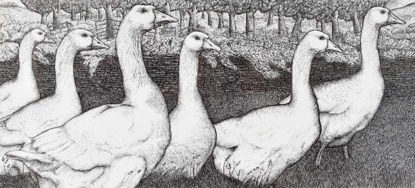 SEREN BELL pen and ink - six geese walking in field with woodland beyond stone wall, 26 x 55cms