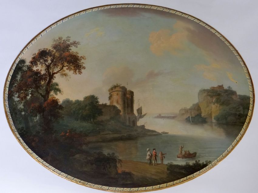 AN IMPORTANT & RARE PONTYPOOL WARE PAINTED TIN PLAQUE circa 1780-1800, of oval form and finely painted with a scene of river estuary, fortification, cliffs and with figures in the foreground including a Naval captain - possibly the River Dart, all within a segmented floral border, 75cms diam Provenance: purchased by vendor's family in 1958 from a Welsh antique dealer Auctioneer's note: possibly painted by the father of the artist Thomas Barker of Bath