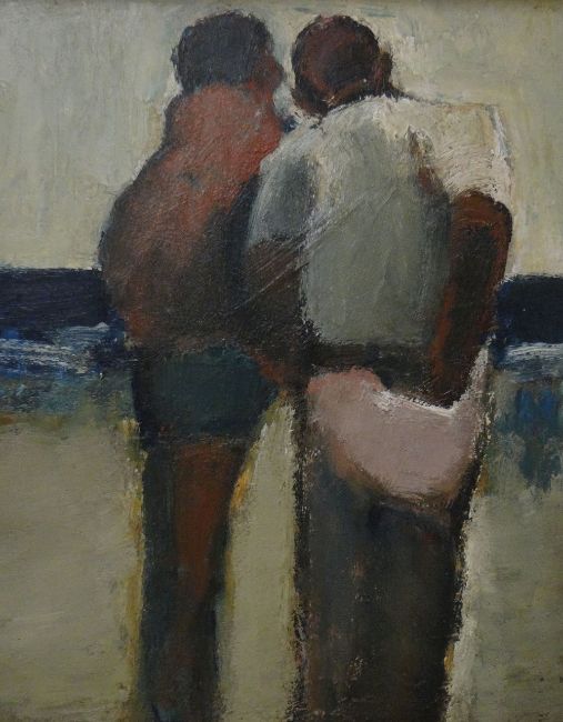 WILL ROBERTS oil on board - two standing figures with one figure reaching behind him, signed and entitled verso 'On a Beach', 26 x 21cms