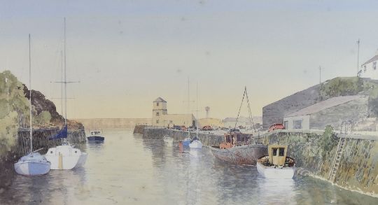 JEREMY YATES watercolour - busy scene at Amlwch Port, signed, 27.5 x 51cms