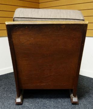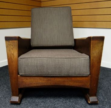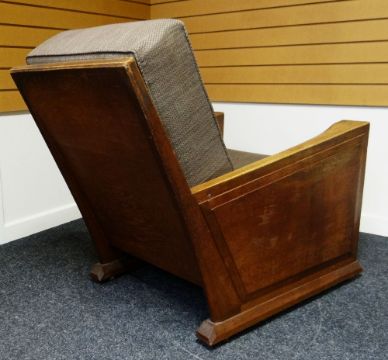 A BRYNMAWR FURNITURE JOINED OAK ARMCHAIR with two cushions and on original casters, 89cms deep Provenance: purchased by the vendor from the house of the late (1901-1982) Iorweth 'Cyfeiliog' Peate, when the vendor purchased Mr Peate's home in St Nicholas, Glamorgan. Images available of Mr Peate seated in the chair. Iorweth Peate was a poet and scholar who co-founded St Fagan's National History Museum