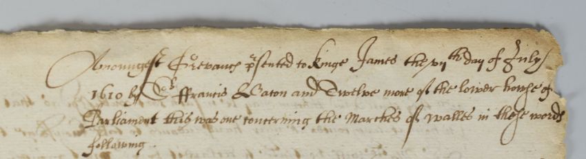 HISTORIC 1610 DOCUMENT RELATING TO 'HARD UP' JAMES I being a handwritten document outlining a set of grievances between The Welsh Marches and the King, which the House of Commons members including Francis Bacon, presented to the James I on 7th July 1610. It can be said that James I had 'a few money' problems during his reign (albeit mostly inherited) and so there was a failed proposal to provide the Crown with more monies in return for settling grievances with councils; this debate was known as The Great Contract and it ultimately failed to materialise, on the back of the folded document mentions a 'Mr Hill' who is an unknown, 31 x 20cms (folded) Auctioneer's note: thanks to Dr Lloyd Bowen at Cardiff University History Department for his expertise and helpfulness in deciphering the document