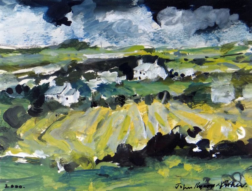 JOHN KNAPP FISHER watercolour - view across fields toward white washed cottages with dark sky, entitled verso on Albany Gallery label 'Pembrokeshire Summer', signed and dated 2000, 10 x 13cms