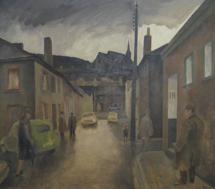 GEORGE CHAPMAN oil on canvas - South Wales Valleys street scene with figures and hilltop church, signed, 64 x 83cms