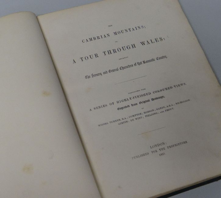 THE CAMBRIAN MOUNTAINS OR A TOUR THROUGH WALES embellished with a series of highly-finished coloured views engraved from original drawings by Messrs, Turner, Compton, De Wint, Prout et al, London 1851, small folio, this edition containing 37 numbered North Wales views with the addition of 21 splendid views in South Wales,