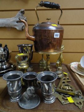 A parcel of metalware including copper kettle, brass bell weights, brass miniature tripod table etc