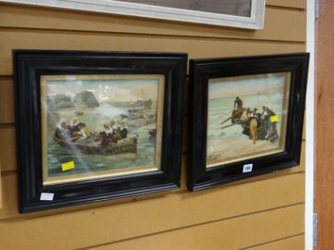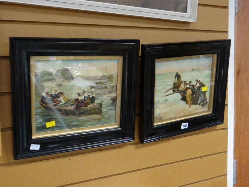 A pair of antique overpainted prints of maritime scenes with small boats & figures, signed (continental)