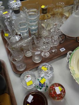 A quantity of glassware including paperweights, lead crystal glasses, a dimple scotch whisky decanter etc