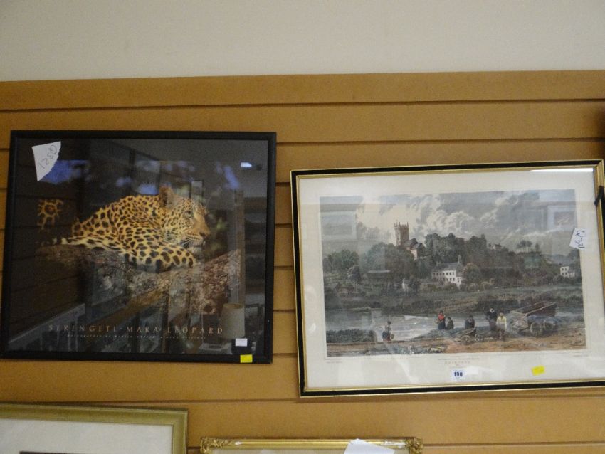 A reproduction antique print of Bridgend & a framed print of a leopard