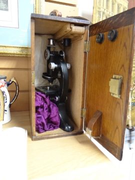 A vintage Beck laboratory microscope in a wooden case