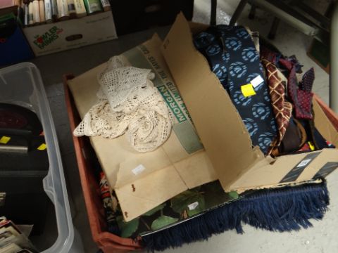 A quantity of lace doilies, fabrics & vintage gentleman's neck ties