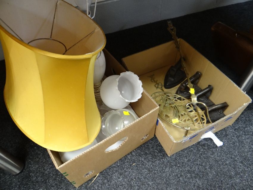 A box of four flat irons, a brass trivet stand & a box of lighting