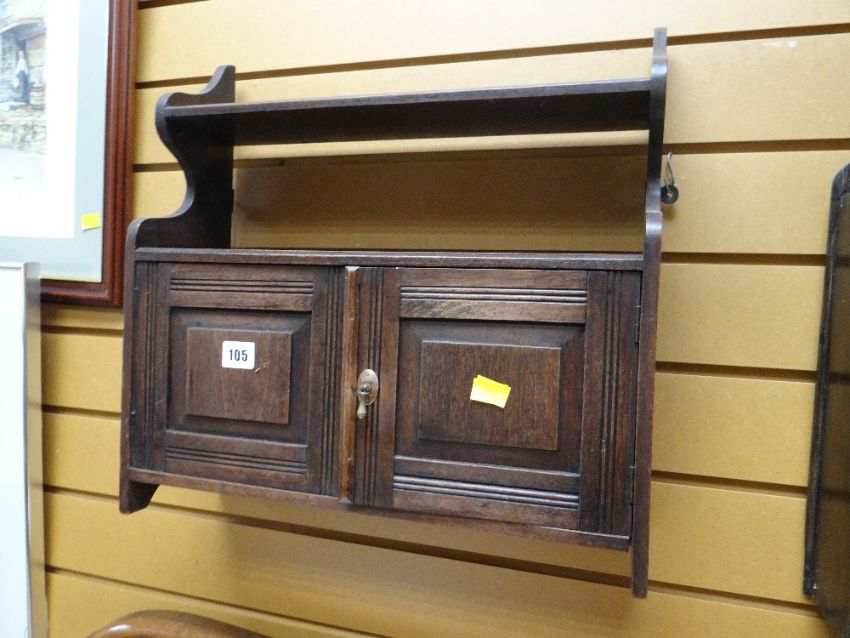 An antique oak hanging tobacco cabinet together with a small gilt framed mirror