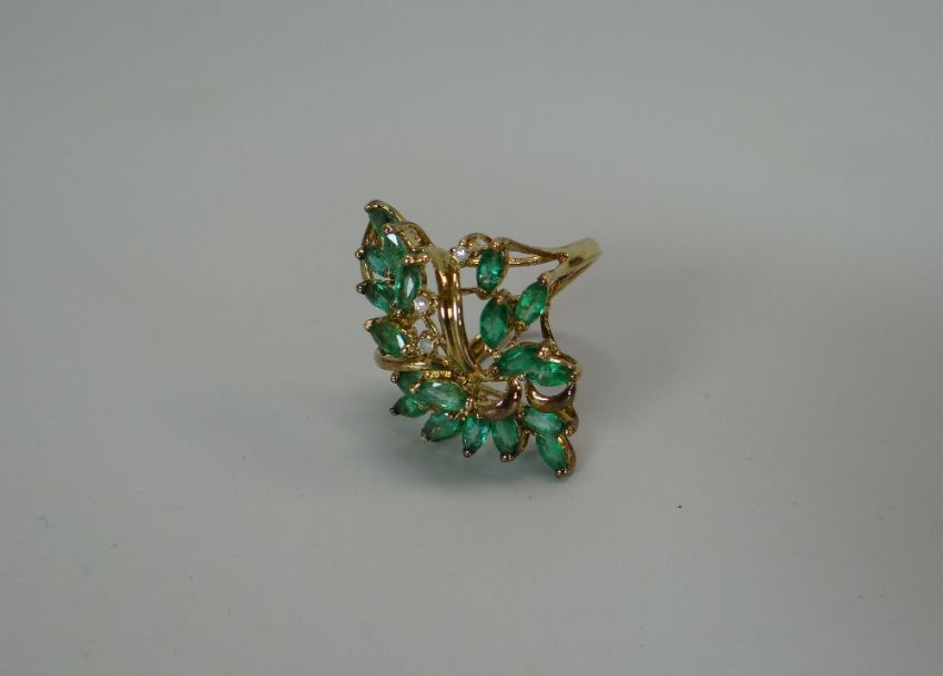 A 9CT YELLOW GOLD, EMERALD & DIAMOND FLORAL DRESS RING