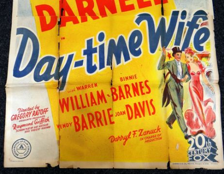 DAY TIME WIFE original cinema poster from 1939, poster is numbered, folded and in sections, wear around fold lines, 220 x 100cms (six-sheet)Provenance: http://www.bbc.co.uk/news/uk-wales-south-east-wales-40966146