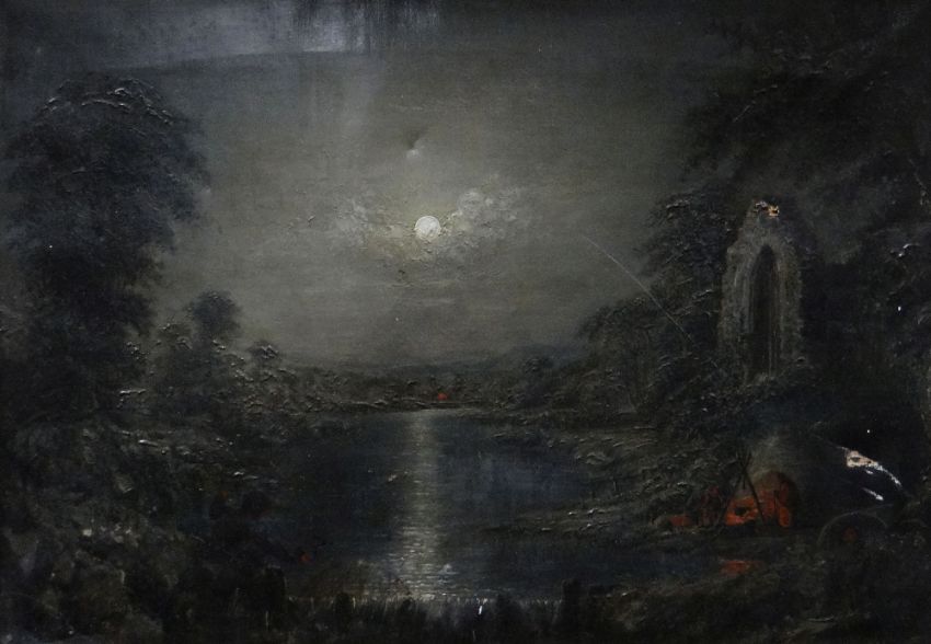 LATE NINETEENTH CENTURY ENGLISH SCHOOL oil on canvas - night time scene with figures around camp fire next to river with church ruins in background, figure fishing on weir, 32 x 44cms