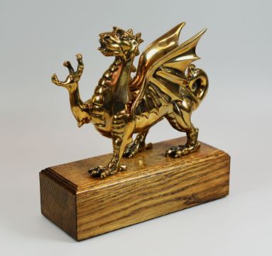 A LIMITED EDITION POLISHED BRONZE WELSH DRAGON (4/250) standing on an oak block plinth, together with certificate, 22cms high