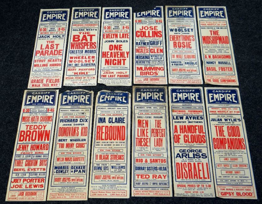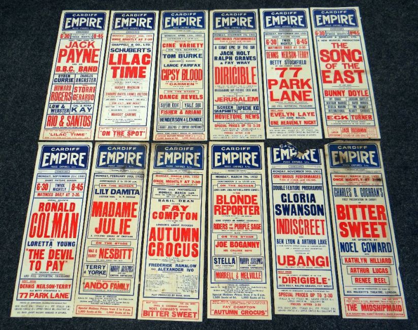 BILL POSTERS a selection of thirty four 1931-1932 posters from the Empire Theatre Cardiff, 76 x 26cms eachProvenance: http://www.bbc.co.uk/news/uk-wales-south-east-wales-40966146