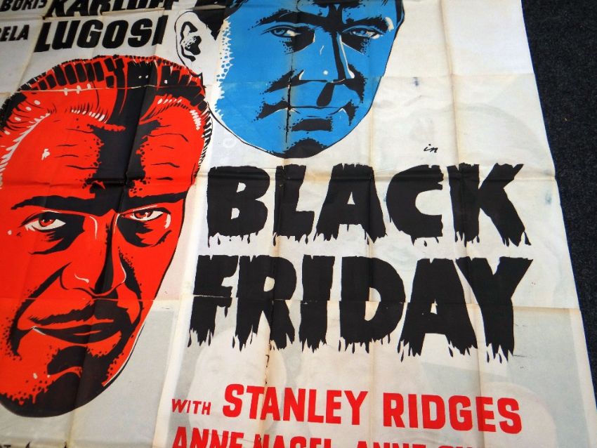 BLACK FRIDAY original cinema poster from 1940 starring Boris Karloff & Bela Lugosi, poster is folded and in six sections, wear around fold lines, 220 x 195cms (twelve-sheet)Provenance: http://www.bbc.co.uk/news/uk-wales-south-east-wales-40966146