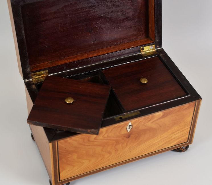 A GEORGE III SATINWOOD & ROSEWOOD INLAID TEA-CADDY of simple rectangular form on corner bun-feet, with a pair of lidded internal compartments, 23cms wide