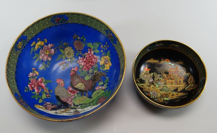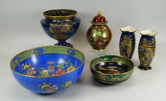 A GROUP OF CARLTONWARE POTTERY ITEMS etc comprising early footed bowl in blue ground, the interior decorated with poultry amongst flowers and foliage, 23cms diam; a pair of blue ground Chinoiserie style vases and similarly decorated pot-pourri and a famille-noir Chinoiserie style footed bowl, together with a Crown Devon covered vase (repaired)