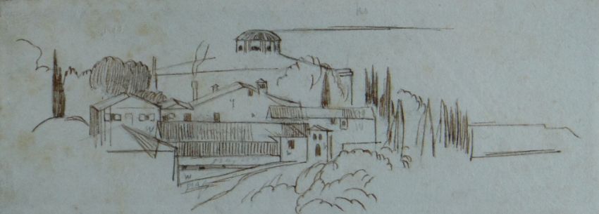 EDWARD LEAR pen & ink - small sketch of Italian village, possibly preliminary sketch for a larger work, pencil notations, 5.5 x 13cms