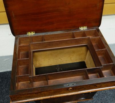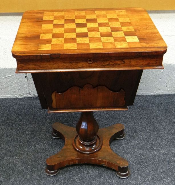 A VICTORIAN CHEQUER-TOP ROTARY GAMES TABLE in rosewood & satinwood over a shaped platform-base, top 58 x 46cms