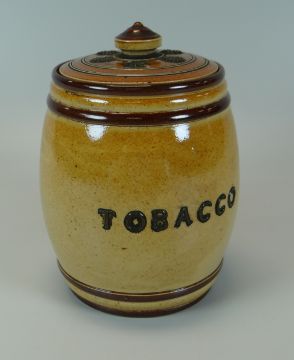 A DOULTON LAMBETH STONEWARE TOBACCO POT & COVER the body decorated with an applied green glazed seated monkey smoking a pipe in a floral motif border and with tobacco in raised lettering, 12cms high (consignment from BBC Bargain Hunt)