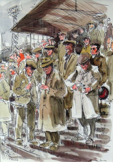 PETER KNOX ink & colour wash - crowd standing on the terraces at a football match entitled 'Terrace', signed with a De Montfort Fine Art label verso, 39 x 28cms