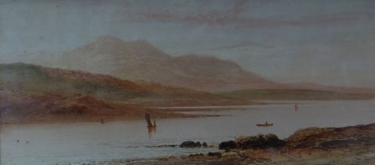 W H EARP watercolour - sailing & rowing boats on lake with mountain in background, 26 x 56cms