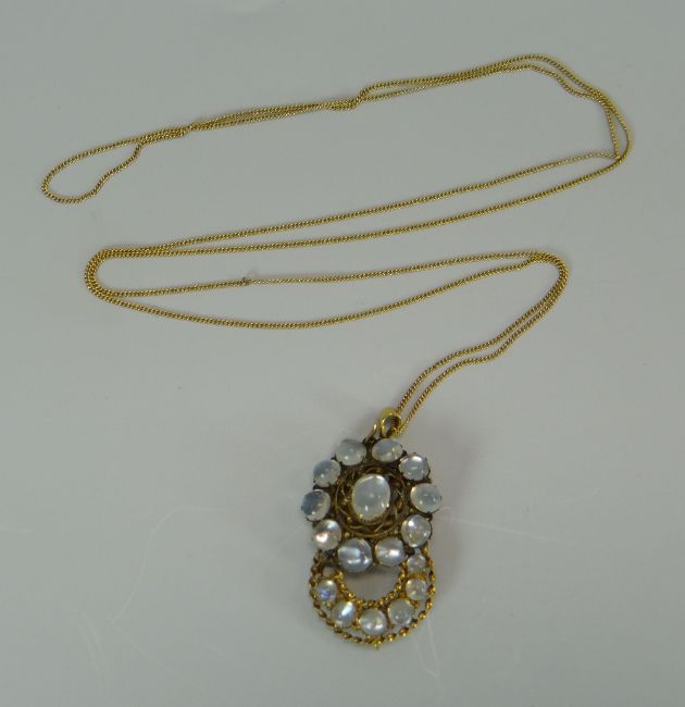 A VICTORIAN MOONSTONE PENDANT in the form of connected crescent and circle, in believed gold setting on a fine gold necklace Provenance: entered by descendant (Great Great Granddaughter) of French portrait artist Nina Fagnani www.en.wikipedia.org/wiki/Nina_Fagnani item(s) would have belonged to Ms Fagnani