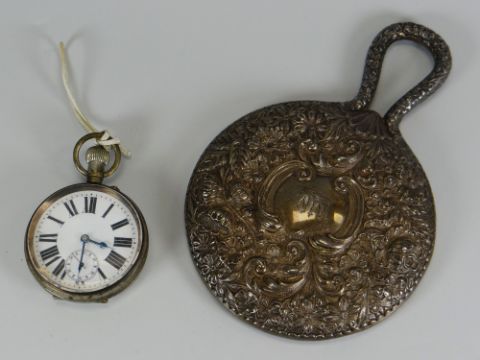 A STERLING SILVER HAND-MIRROR & ENGLISH SILVER WATCH-HOLDER together with a white-metal 'Goliath' pocket-watch Provenance: entered by descendant (Great Great Granddaughter) of French portrait artist Nina Fagnani www.en.wikipedia.org/wiki/Nina_Fagnani item(s) would have belonged to Ms Fagnani