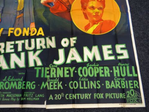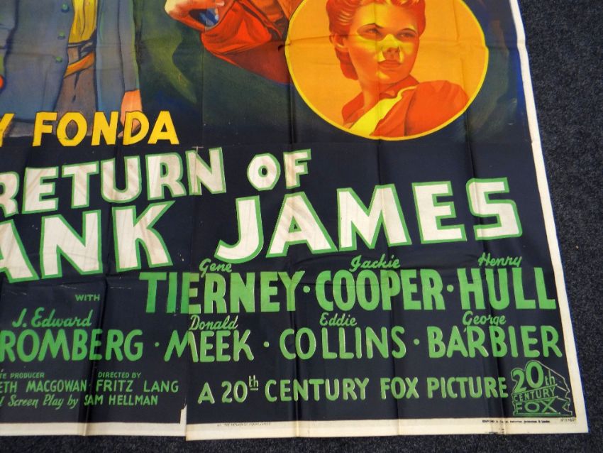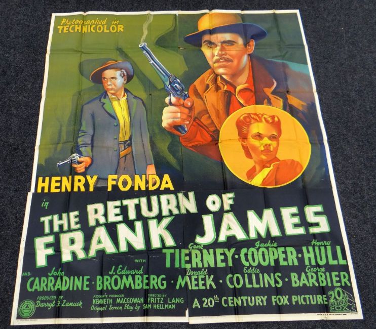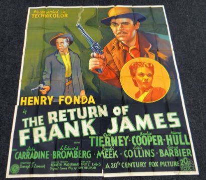 THE RETURN OF FRANK JAMES original cinema poster from 1940 featuring Henry Fonda & John Carradine, poster is numbered, folded and in four sections, wear around fold lines, 220 x 195cms (twelve-sheet)Provenance: http://www.bbc.co.uk/news/uk-wales-south-east-wales-40966146