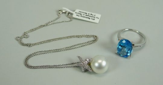 A PEARL & DIAMOND PENDANT & CHRISTOPHER JAMES BLUE STONE RING